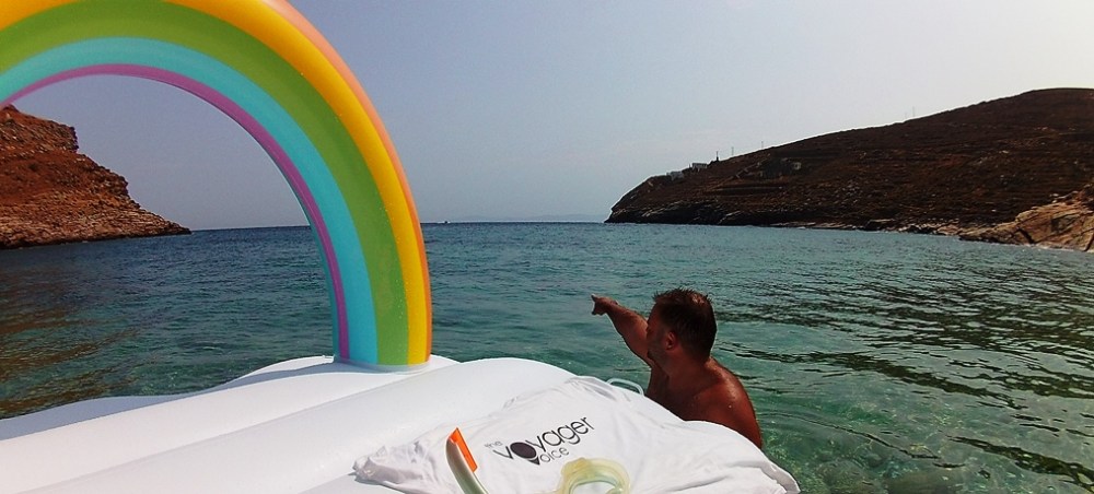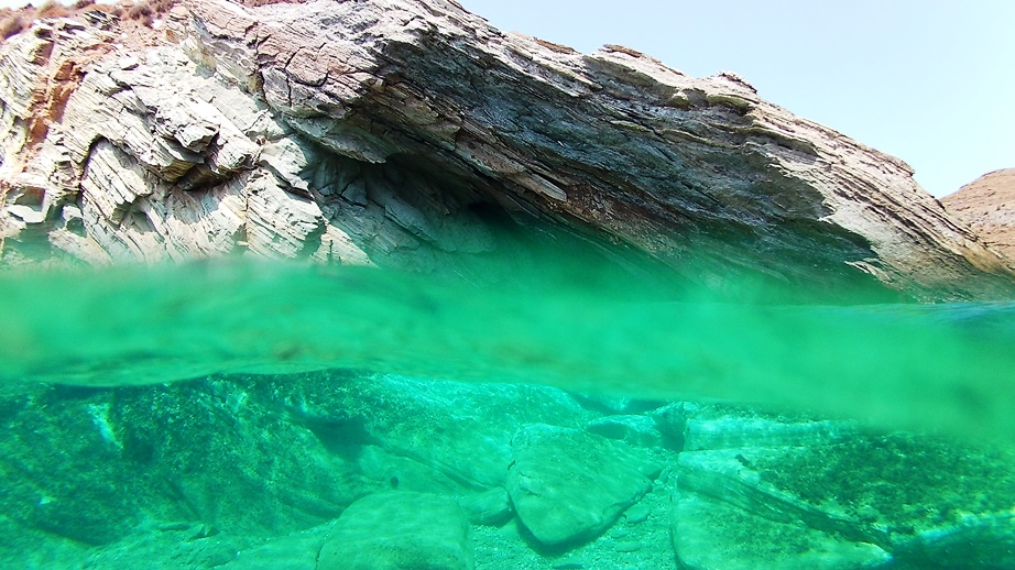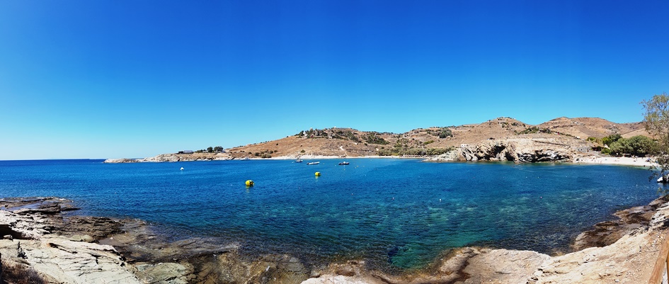Although you may need to reserve your sunbed at Koundouros and Koundouraki many weeks before (i.e. mobile applications also available), there are also alternative options to select and dive deep. One option is a special ready-to-dive access to the sea from” Vrahos” beach bar on the rocks, which provides 180o views over the famous gulf of Koundouros with its impressive villas and mill houses.