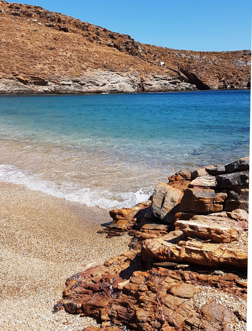 Waves turn the volume up when they interact with the sand and the pebbles of the hidden beach of Psathi. So close to go, but not an easy road to follow. The view and dive definitely worth a visit, when the sea is calm.