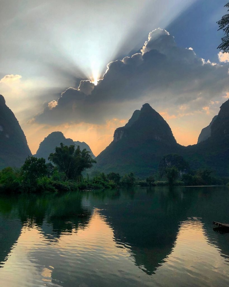 Our camera captures the magical landscape of the morning sun situated between the clouds as we cross the holy waters of River Li on a cruise boat. The water symbolises abundance.